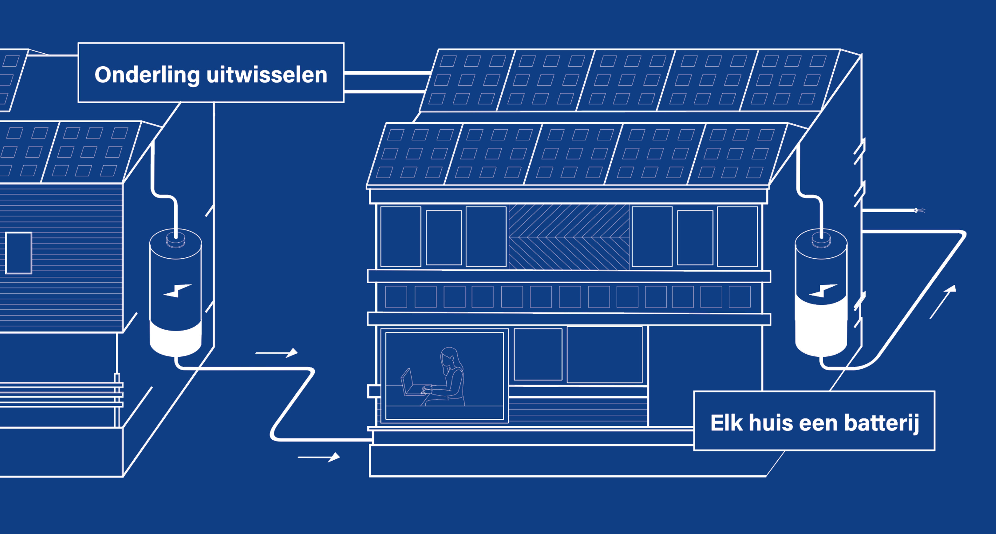 Elke woning heeft zijn eigen batterij. De zonne-energie die niet direct gebruikt wordt, kan hier worden opgeslagen. De batterij heeft het formaat van een koelkast. Als alle batterijen vol zijn en niemand nog extra energie nodig heeft, levert Schoonschip terug aan het net. Het meest voordelig is natuurlijk om de stroom direct te gebruiken.